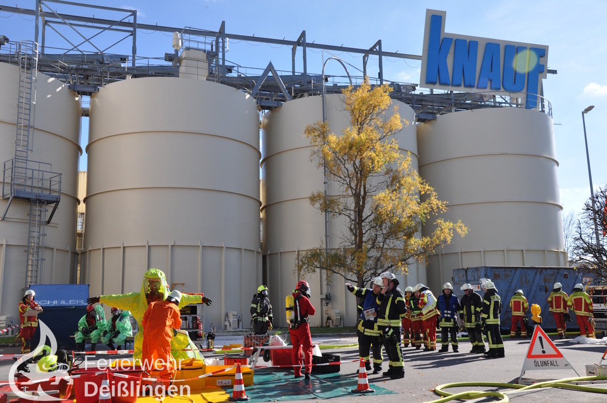 Dichter Rauch, Chemikalienschutzanzüge und höchste Konzentration: Die Feuerwehren Deißlingen, Rottweil und Schramberg probten gemeinsam mit dem Rettungsdienst und dem Technischen Hilfswerk den Ernstfall – ein Gefahrstoffaustritt nach einem Staplerunfall auf dem Gelände der Firma Knauf in Deißlingen.