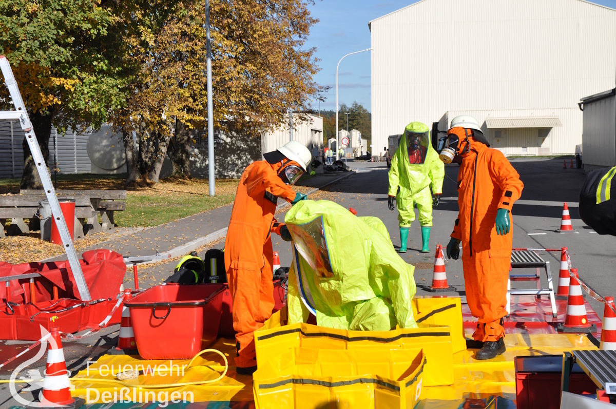 Während die Feuerwehr Deißlingen den Brandschutz sicherstellte, rückten die Spezialkräfte zur Unfallstelle vor und dichteten den beschädigten Behälter ab, sodass eine weitere Ausbreitung der fiktiven Schwefelsäure verhindert werden konnte. Der CBRN-Erkunder führte zusätzlich Messungen innerhalb und außerhalb des Betriebsgeländes durch. Im weiteren Verlauf der Übung wurden alle im Gefahrenbereich eingesetzten Kräfte dekontaminiert und rettungsdienstlich betreut.
